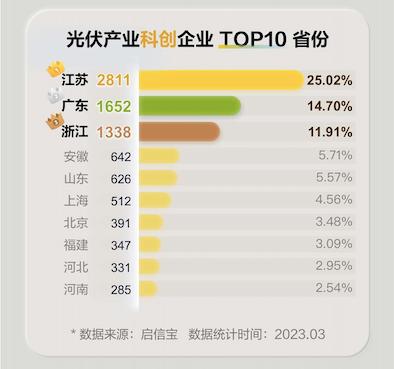 《光伏图鉴》显示,从省份分布来看,截至2023年3月,江苏、山东、广东三个省份光伏产业存续企业数量最多,集中度最高。其中,江苏领跑全国,光伏产业存续企业数量超9000家,山东、广东等地企业数量均在5000家左右,领先于其他省份。