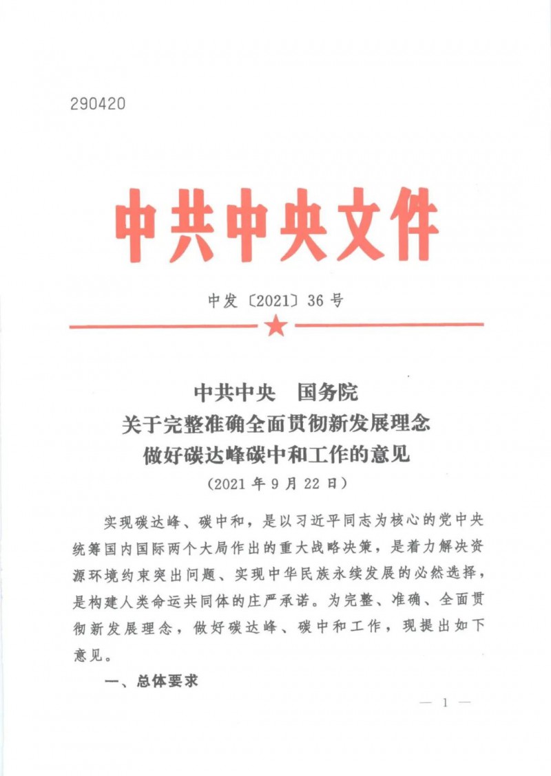 9月22日,中共中央下发《关于完整准确全面贯彻新发展理念做好碳达峰碳中和工作的意见》。