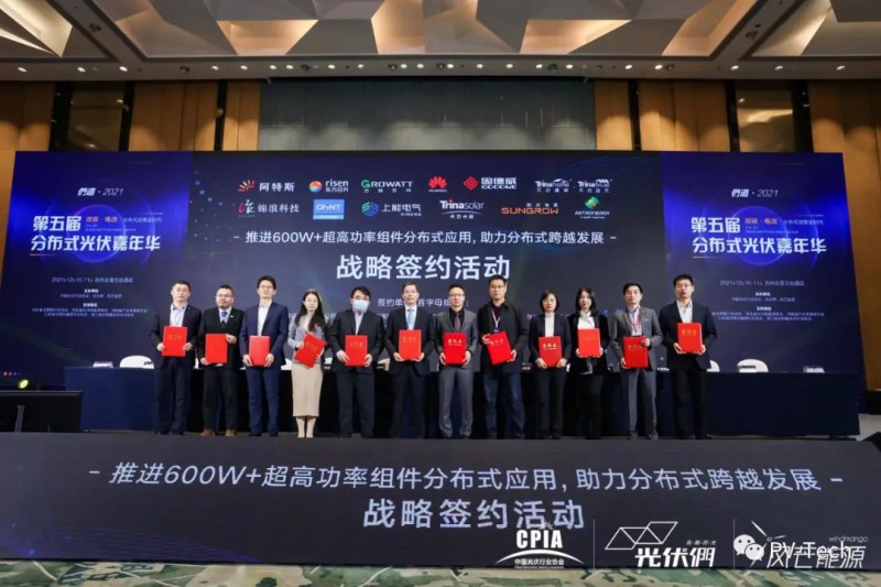 为了进一步推动分布式场景的光伏发展,12月10日,全球领先光伏组件企业阿特斯、东方日升、天合光能携天合智慧分布式、正泰太阳能,以及7家主流逆变器厂商固德威、古瑞瓦特、华为、锦浪科技、上能电气、阳光电源和正泰电源(按首字母排序),共同举行了战略签约仪式,联合声明共同推进600W+超高功率组件分布式应用,构建600W+分布式应用体系,推动分布式产业结构高端化、分布式能源消费低碳化转型。