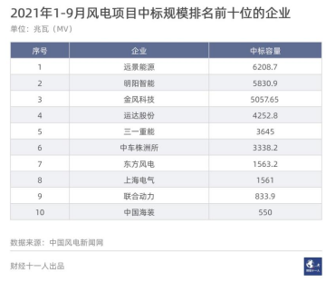 图2显示,2021年前三季度,远景能源的订单量为6208.7MW,大幅领先于金风科技的5057.7MW。另据国际能源网/风电头条统计,12家央企2021年全年采购的风机里,远景能源拔得头筹,累计中标6794MW,而金风科技累计中标5866MW,排名第二。这12家央企2021年的风电招标量约占全国新增风电装机的四分之三。