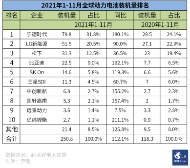 但优势的确立主要得益于中国新能源市场的扩张。宁德时代2021年1-11月的装机量增量总量为51.3GWh,而中国市场贡献的增量为40.93GWh,贡献了整体增量的79.79%。而同期中国市场动力电池装机总量为128.3GWh,占全球250.8GWh的51.16%。这些数据显示,宁德时代的高速增长依赖于中国市场的快速扩张。