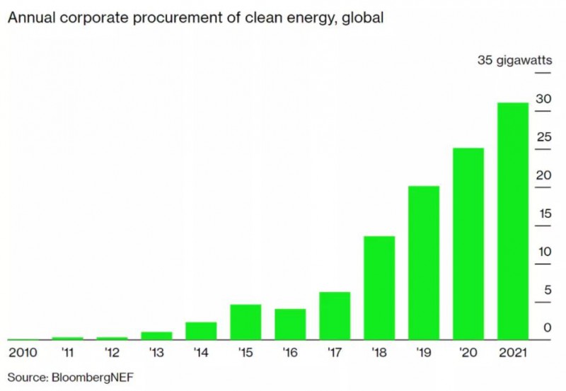 彭博新能源财经报道,2021年有 67 家公司加入了 RE100(100%可再生能源倡议),总计有 355 家公司承诺使用 100% 可再生能源。2021年全球企业采购可再生能源合同的容量创下了 31GW 的新纪录。其中大部分产能是在美洲采购的,其中 17GW 来自美国的企业,3.3GW 来自北美和南美的其他国家的企业。