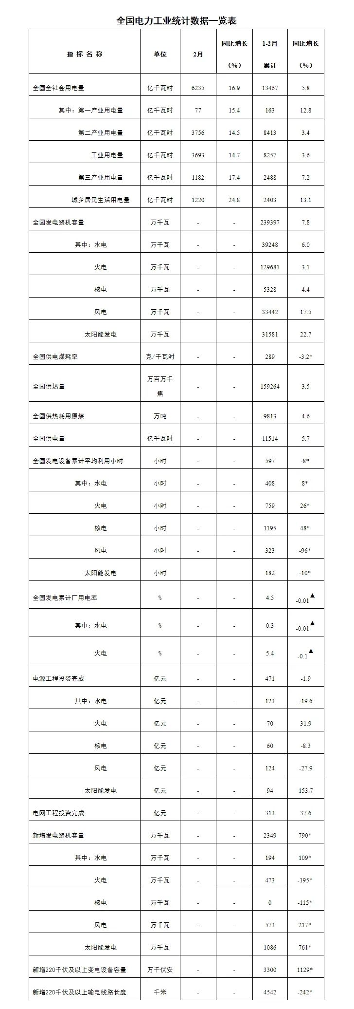 注:1.全社会用电量为全口径数据,全国供电量为调度口径数据。2.“同比增长”列中,标*的指标为绝对量;标▲的指标为百分点。