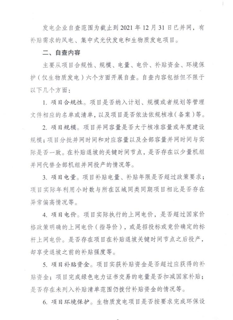 发电企业自查范围为截止到2021年12月31日已并网,有补贴需求的风电、集中式光伏发电和生物质发电项目。