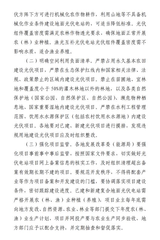 用地方面,允许在设施农业上建设农光互补、菌光互补项目,利用农用地布设的光伏方阵可不改变原用地性质。光伏复合项目应坚持“以农为先”,新建复合地面光伏电站光伏组件安装高度最低处不低于2米,方阵前后阵列中心间距原则上不少于7米。严禁占用永久基本农田、在生态保护红线内以及各类自然保护地建设光伏项目。此外,已建和新建复合地面光伏电站需严格开展农(林、渔)业种植(养殖),项目业主每年底需向地方发改委、自然资源、农业、林业等部门提交下年度农(林、渔)业生产计划,项目并网投产要与农业生产同步验收。