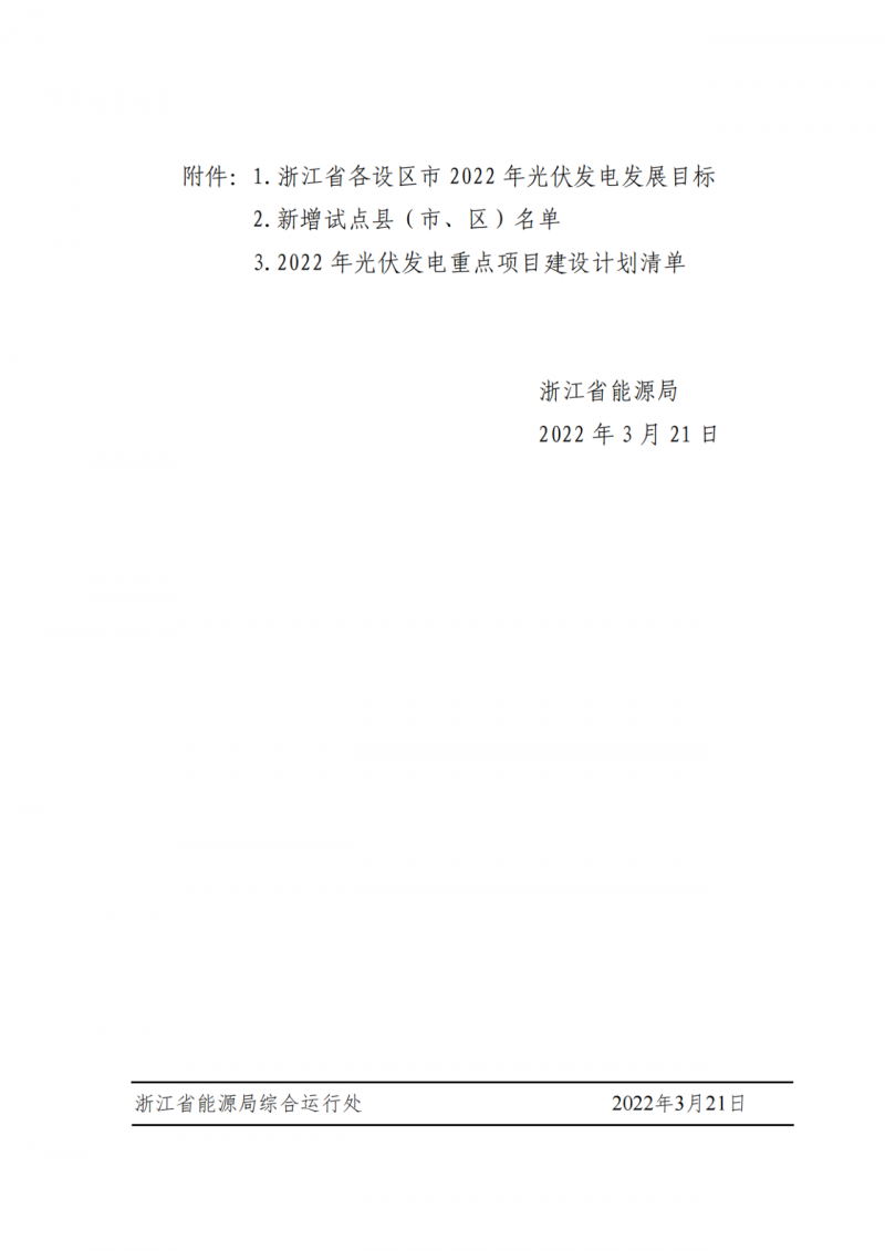 除此外,浙江省能源局要求持续加快分布式光伏建设,并扩大整县(市、区)屋顶分布式光伏开发试点建设范围,新增36个整县试点名单,列入试点名单县(市、区)2022年光伏新增不得少于50MW,总规模为1.8GW。
