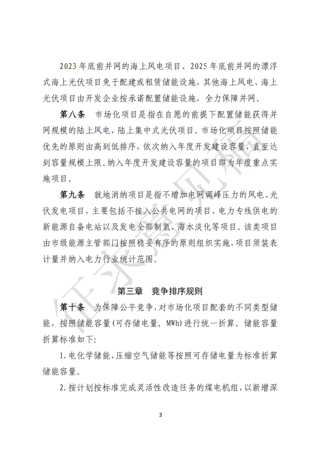 3)2023 年底前并网的海上风电项目、2025 年底前并网的漂浮式海上光伏项目免于配建或租赁储能设施,其他海上风电、海上 光伏项目由开发企业按承诺配置储能设施,全力保障并网。