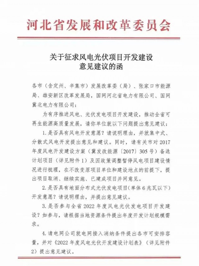 在征求意见函中,河北省发改委要求各地主管部门就风电、地面分布式光伏开发意愿进行说明,并请电网公司就电网接入消纳条件提出各市可安排容量,并对《2022年度风电光伏开发建设计划表》提出意见建议。