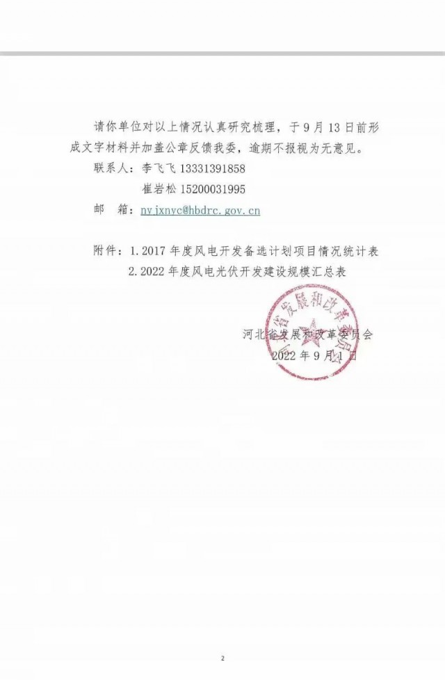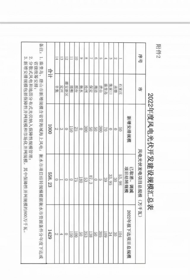 9月1日,河北省发改委发布了《关于征求风电光伏项目开发建设意见建议的函》,并公示了 2022年度风电、光伏开发建设规模汇总表。