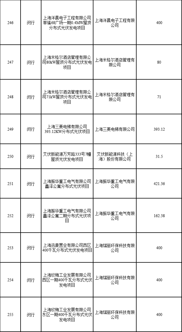 13个项目申请项目变更条件予以确认,其中:企业分布式项目5个。(1)经青浦区发展改革委申请核实,“上海电气建筑节能有限公司利用国展中心屋顶建设2.2MW分布式光伏电站项目(2017年第二批目录)”,单位名称从“上海电气建筑节能有限公司”变更为“上海电气数智生态科技有限公司”。(2)经崇明区发展改革委申请核实,“上海绿兆新能源科技有限公司实施崇匠建设(上海)有限公司52.02KW屋顶分布式光伏发电项目(2021年第一批目录)”,单位名称从“上海绿兆新能源科技有限公司”变更为“崇电科技(上海)有限公司”。(3)经嘉定区发展改革委申请核实,“上海圣飞新能源嘉定区兴贤路789号上海连盈螺丝有限公司559千瓦分布式光伏发电项目(2021年第一批目录)”,单位名称从“上海圣飞新能源科技有限公司”变更为“嘉兴胜锦新能源有限公司”。(4)经金山区发展改革委申请核实,“上海复镝实业有限公司20千瓦分布式光伏发电项目(2018年第一批目录)”,单位名称从“上海复镝实业有限公司”变更为“上海复镭投资管理有限公司”。(5)经闵行区发展改革委申请核实,“国核工程有限公司146.965KWp屋顶分布式光伏发电项目(2020年第一批目录)”,单位名称从“国核工程有限公司”变更为“上海核工程研究设计院有限公司”。