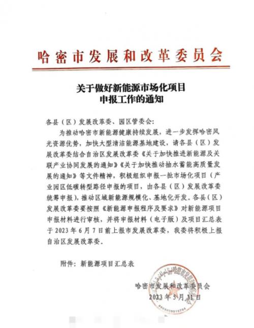 《通知》指出,为推动哈密市新能源健康持续发展,进一步发挥哈密风光资源优势,加快大型清洁能源基地建设,请各县(区)发展改革委结合自治区发展改革委《关于加快推进新能源及关联产业协同发展的通知》《关于加快推动抽水蓄能高质量发展的通知》等文件精神,积极组织申报一批市场化项目(产业园区低碳转型路径申报的项目,由各县(区)发展改革委统筹申报),推动区域新能源规模化、基地化开发。