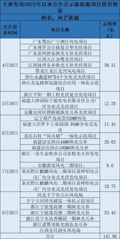 根据公开信息不完全统计,2023年以来,大唐发电共发布5个新能源项目投资计划公告。其中,风、光项目共计27个,总投资超147.86亿元。