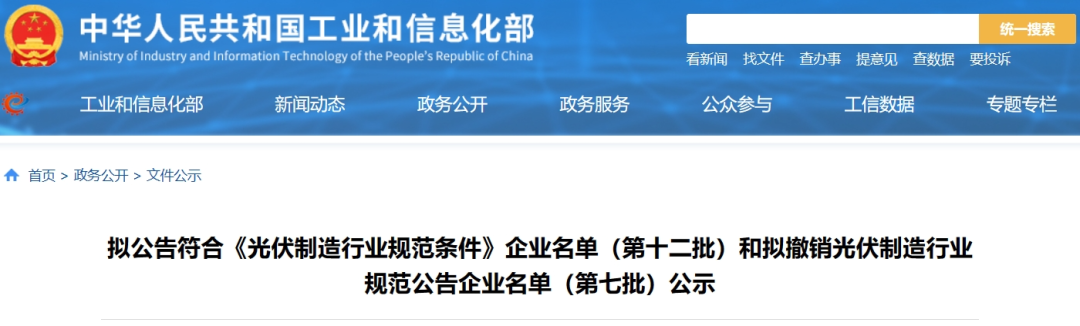 12月6日,工信部发布的《拟公告符合《光伏制造行业规范条件》企业名单(第十二批)和拟撤销光伏制造行业规范公告企业名单(第七批)公示》显示,符合第十二批条件的光伏企业有12家,撤销第七批的光伏企业有14家,同时有5家光伏企业名称发生变更。