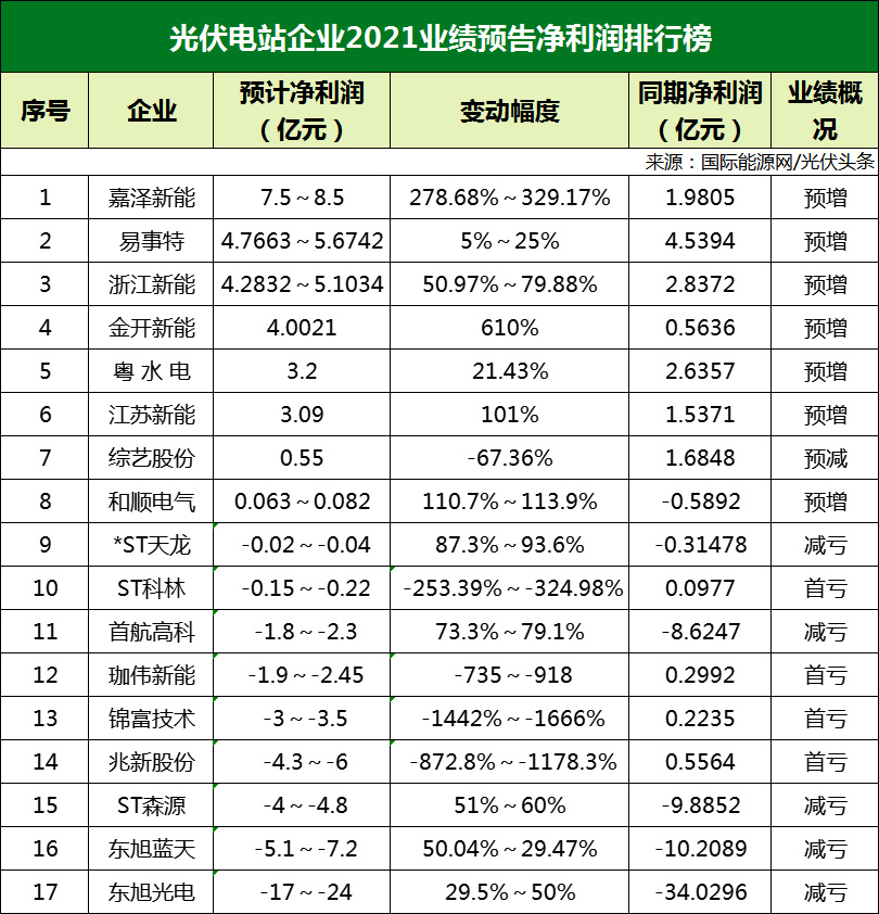2021年由于光伏产业链上游价格暴涨,导致光伏产业链末端的光伏企业承受了很大压力,光伏新增装机不及预期。这直接反映在电站企业的财务报告中。17家与光伏电站相关的企业8家净利润为正值,9家处于亏损状态。