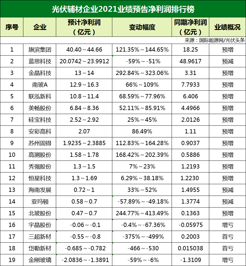 2021年的光伏产业链不仅硅料上涨,光伏胶膜、银浆等辅材也有不同程度的上涨,光伏玻璃由于受此前价格上涨的影响,一直处于高位。这直接反映在一众光伏辅材企业的预增公告中。