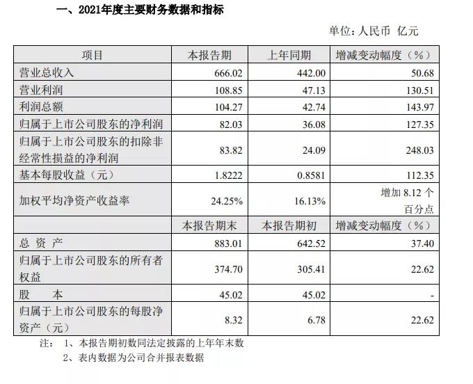 2月13日晚通威股份(600438.SH)发布2021年度业绩快报,经初步核算,2021年度公司实现营业收入666.02亿元,同比增长50.68%;实现归属于上市公司股东的净利润82.03亿元,同比增长127.35%;扣除非经常性损益后归属于上市公司股东的净利润为83.82亿元,同比增长248.03%;基本每股收益1.8222元,同比增长112.35%。