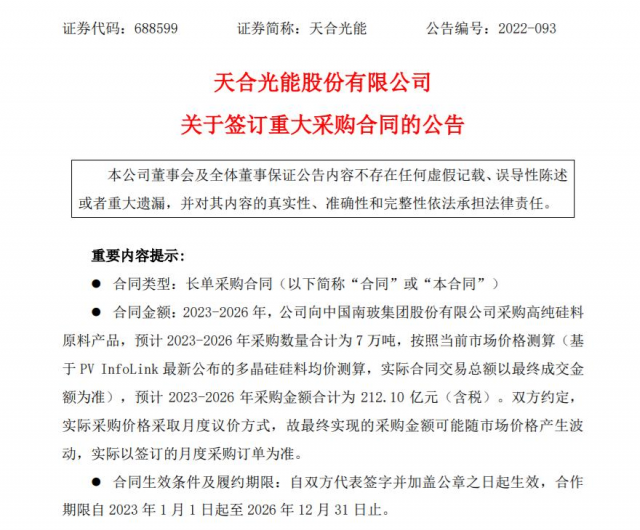 9月13日,天合光能(SH:688599)发布公告,公司与中国南玻集团股份有限公司(证券简称:南玻A;证券代码:SZ:000012)签订高纯硅料长单采购合同。合同约定,2023-2026 年间,天合光能拟向南玻集团采购7万吨高纯硅料原料产品,按照当前市场价格测算,采购金额约为212.10亿元(含税)。