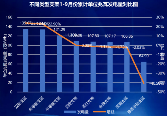 从支架实证数据分析,前三季度整体来看双轴跟踪系统发电量最高,斜单轴和平单轴次之,分别较固定支架发电量增益依次为23.83%、22.89%和11.2%;全维支架第一季度和第二季度由于支架跟踪故障,正面辐照较低,7月份开始正常运行后发电量明显提高,第三季度发电量最高;另外,柔性支架总体发电量略低于固定支架,两种柔性支架之间发电量一致性相对较差,累计发电量差1.8%。同时,从实证出力曲线来看,跟踪支架与固定支架、柔性支架相比功率曲线更加偏平,对电力系统更加友好。