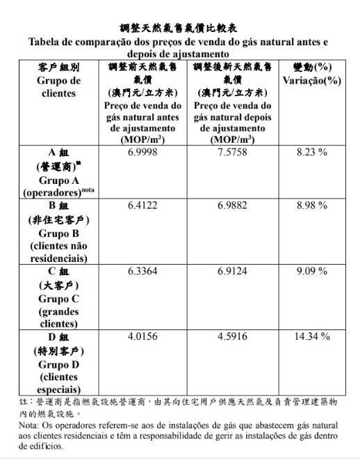 四个客户组别的天然气售气价格将分别上调约8%至14%(详见附表),其中住宅客户(A组)为主要的天然气用户,预计每月平均用气费将增加约澳门元7.5元。
