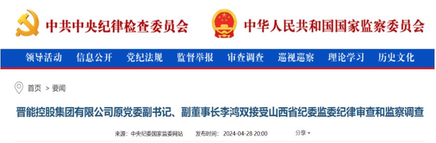 中央纪委国家监委网站4月28日消息,据山西省纪委监委消息:晋能控股集团有限公司原党委副书记、副董事长李鸿双涉嫌严重违纪违法,目前正接受山西省纪委监委纪律审查和监察调查。
