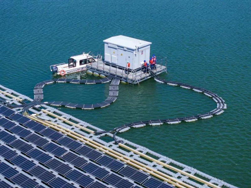 国网山东电力员工在世界单体最大水上漂浮式光伏电站协助用户开展设备运行维护。