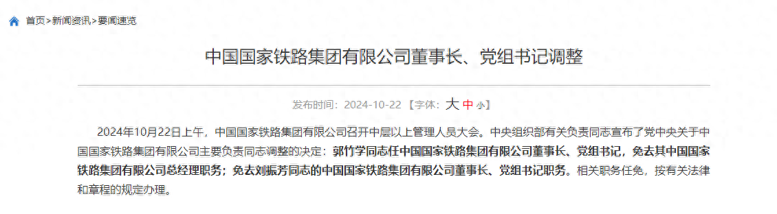 中央组织部有关负责同志宣布了党中央关于中国国家铁路集团有限公司主要负责同志调整的决定:郭竹学同志任中国国家铁路集团有限公司董事长、党组书记,免去其中国国家铁路集团有限公司总经理职务;免去刘振芳同志的中国国家铁路集团有限公司董事长、党组书记职务。