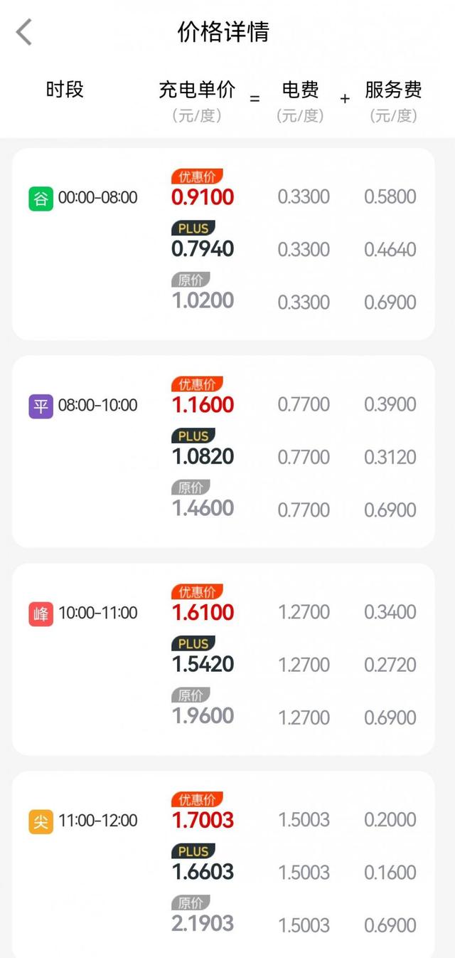充电桩“峰谷分时”电价时段会有“峰、谷、平”三个价位,分别代表用电的高峰期、低谷期和正常用电期。中午时分,一般是充电的平时时段,价格较低。