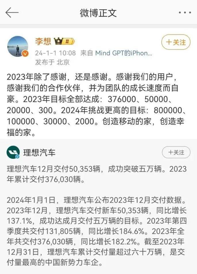 理想汽车董事长兼ceo李想在社交媒体发声:“2023年除了感谢,还是感谢。感谢我们的用户,感谢我们的合作伙伴,并为团队的成长速度而自豪。2023年目标全部达成。”