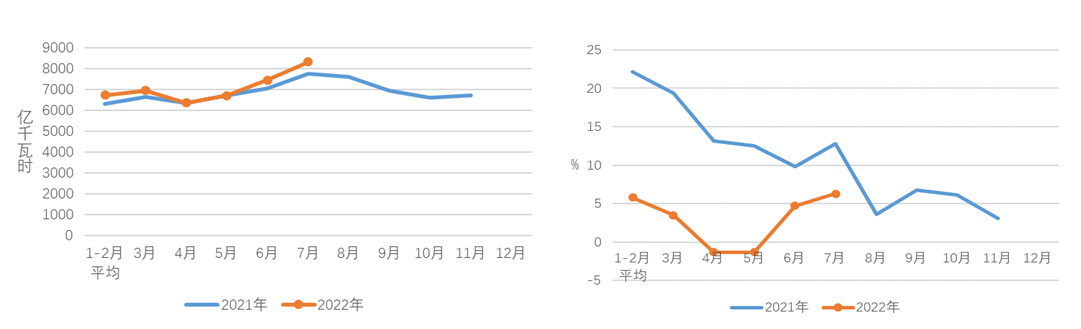 图1 2021、2022年分月全社会用电量及其增速