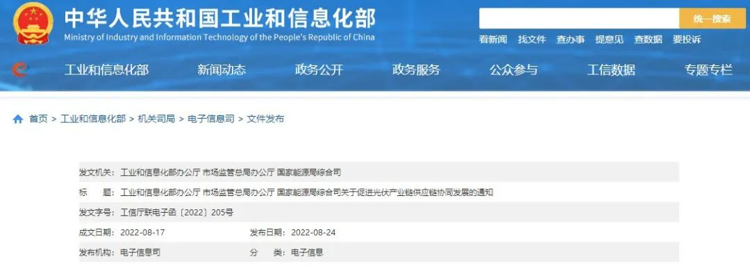 本网讯 8月24日,工信部办公厅、市场监管总局办公厅、国家能源局综合司发布《三部门关于促进光伏产业链供应链协同发展的通知》。