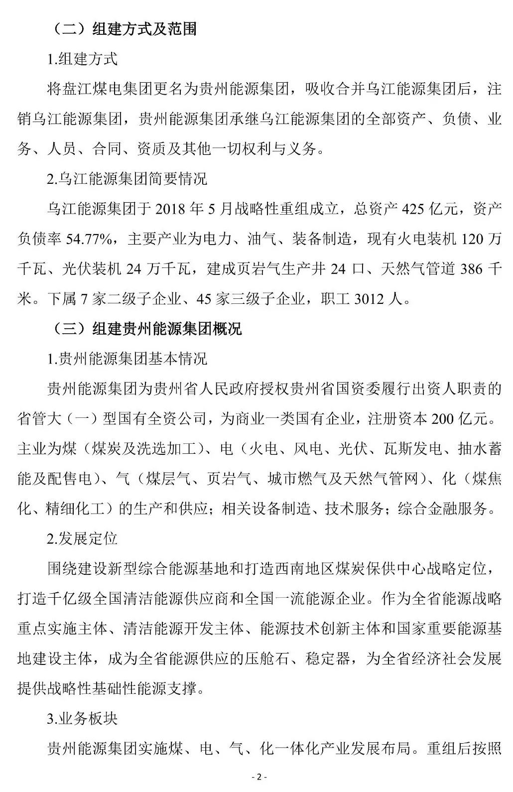 《公告》还称,重组后按照专业化整合原则,贵州能源集团将用 1—2 年时间,有序开展集团各业务板块整合,重点打造煤炭、先进煤电、新能源、天然气、现代煤化工及支撑保障业务等 6 大业务板块,加快形成协同效应和规模效益。