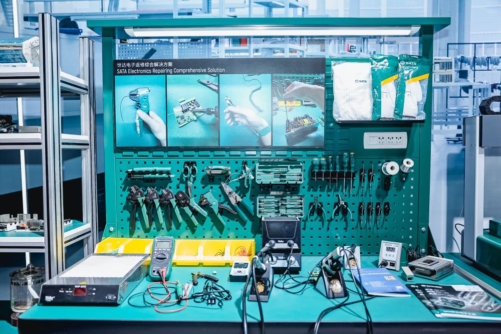 3) SATA世达电子综合返修方案,搭配锡丝手工焊台,微型夹持镊子,各规格剥线压接钳,专用电子微型螺丝刀,高精度电表等,可应对各种产品返修检测需求。