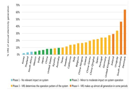 图1 不同国家/地区波动性可再生能源发电占比及相应的系统集成阶段(2018年)