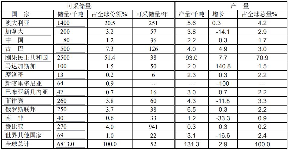 1、 钴:世界上钴可采储量最多的国家依次为刚果民主共和国和澳大利亚,占全球总量的71.9%。中国为全球第九位。钴生产量最多的国家为刚果民主共和国,占全球总量的70.9%。中国钴生产量仅为全球第十位。