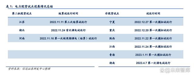 现货市场分省试运行提速,现货时代或将来临。2022 年 11 月,国家能源局公开发布《电 力现货市场基本规则(征求意见稿)》《电力现货市场监管办法(征求意见稿)》并征求 社会意见,标志着全国范围内的省级电力现货市场发展将出现提速。第一批 8个试点地区 (南方(以广东起步)、蒙西、浙江、山西、山东、福建、四川、甘肃)已于 2022 年 6 月 底启动长周期结算试运行,第二批 6个试点地区(上海、江苏、安徽、辽宁、河南、湖北) 已于 2022 年 7 月底前启动模拟试运行。四季度以来,第二批现货试点中湖北、河南已经开 始启动调电试运行,江苏也于 11 月开展第三次结算试运行。此外,非现货试点省份对于现 货市场的建设推进积极性也较高:宁夏、重庆、陕西、江西在 2022 年四季度均开展首次模 拟试运行;青海、湖南也分别于 2023 年 1 月和 4 月开展模拟试运行和调电试运行。2023 年有望出现全国范围内的现货市场热潮,“现货时代”或将来临。