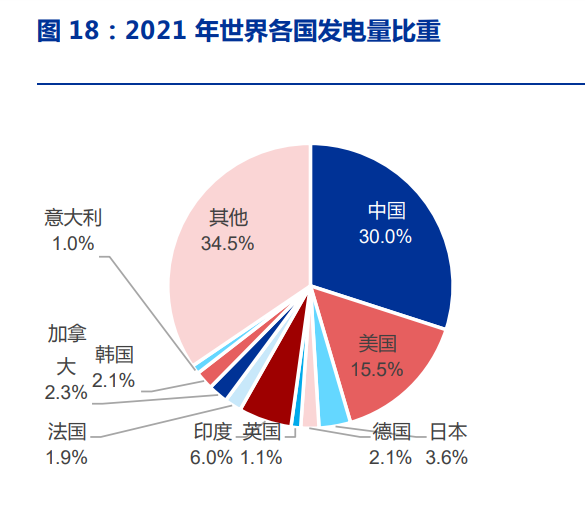 我国面临着人类历史上最为艰巨的新能源转型之路。中国如今已经拥有全世界最大的 电力系统,2021 年我国发电量占全球比例已达到 30%,接近第二名美国的 2 倍,更重要 的是我国的用电规模仍在快速增长,2021 年我国全年新增发电量达 7552 亿千瓦时(BP 口径),是德国 2021 年全国用电量的接近 1.3 倍,而德国总发电量从近 20 年基本维持在 稳定水平。