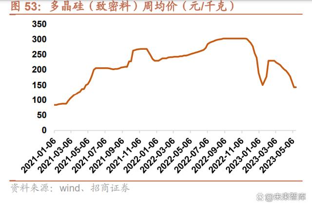 硅料价格持续下降,新建产能规模庞大,有望推动光伏装机进一步增长。2022 年 12 月开始,随着硅料产能的逐步释 放,多晶硅和组件价格开始大幅回落。2023 年 2 月,硅料价格出现轻微反弹,主要系需求回暖+开工补库所致,目前 已重新进入下行通道。截至 2023 年 5 月 17 日,多晶硅(致密料)价格为 143 元/千克,相较 2022 年 11 月 30 日的 高点 295 元/千克下降 51.53%;单面单晶 PERC 组件价格(182mm)为 1.66 元/瓦,相较 2022 年 11 月 23 日的高 点 1.97 元/瓦下降 15.74%。硅业分会表示,2023 年国内多晶硅产量保守估计有 146 万吨,加上进口多晶硅可达 156 万吨,这些硅料已经足够 600GW 光伏装机,已远超 2023 年的全球光伏装机量需求,过剩的产能有望推动硅料和组 件价格进一步下行,提升运营商的装机意愿。