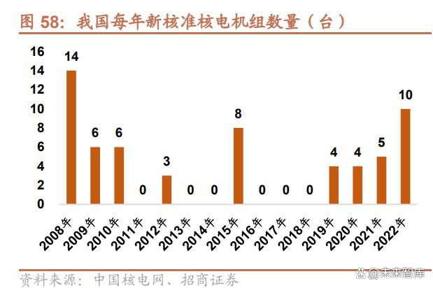 2021 年国家首次提出“积极有序发展核电”。同年,我国新增 5 台核准机组;2022 年新核准 10 台机组,核电审批和 开工节奏明显提速。根据世界核协会,截至 2023 年 5 月,我国在运+在建机组总数达到 77 台,已经超过法国,仅次 于美国。预计在未来 5 年间,中国将进一步加快扩大装机规模,保持每年 6 至 8 台核电机组的核准开工节奏。