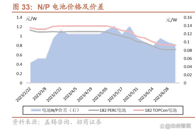 下游接受度跃升。经历 1 年多的市场验证,下游投资方对 N 型优势理解更加深 刻。尤其是双面率、衰减及温度系数等优势带来的发电量增益,随实际应用的实 证数据逐步体现,TOPCon 已得到行业性的认可。近期部分招标项目 N 型份额 已由此前 10%上下提升至近 50%。2021 年 PERC 市占率约 91%,2022 年降至 88%,而 N 型份额由 2021 年 3%提升至 9%,N 型电池进入规模化应用阶段。 溢价不断放大。近期 N 型组件与 P 型组件的价差,已由 2 月的 0.05 元/W 逐步 攀升至 0.06-0.14 元/W(近期组件报价偏分散),整体溢价逐步放大,原因主要 系随 N 型产品进一步降本增效、电站有效验证的形成,TOPCon 优势不断验证, 下游对 N 型组件的需求优先级更高,高效组件的议价能力更强。如果效率继续提 升,溢价有望进一步放大。而 TOPCon 电池供应相对紧张,相较 PERC 溢价由 0.06 元/W 上下爬升至 0.1 元/W。