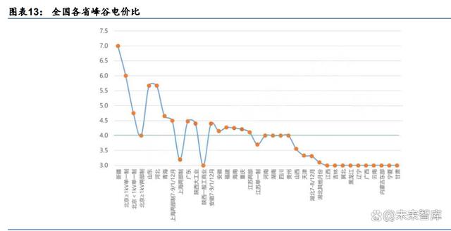 国家发改委推动合理拉大峰谷电价差,引导电力用户削峰填谷。2021 年 7 月,国家发改委 印发《关于进一步完善分时电价机制的通知》,部署各地进一步完善分时电价机制,合理拉 大峰谷电价价差,为引导电力用户削峰填谷、促进储能加快发展释放了清晰强烈的价格信 号:(1)优化峰谷电价机制:积极优化峰谷电价机制,科学划分峰谷时段,合理确定峰谷 电价价差,系统峰谷差率超过 40%的地方,峰谷电价价差原则上不低于 4:1;其他地方原 则上不低于 3:1。(2)建立尖峰电价机制:在峰谷电价的基础上推行尖峰电价机制,主要基 于系统最高负荷情况合理确定尖峰时段,尖峰电价在峰段电价基础上上浮比例原则上不低 于 20%。可参照尖峰电价机制建立深谷电价机制。随后,各省市分时电价政策步入快速完 善期,出台相关政策调整峰谷时段划分和电价浮动比例。