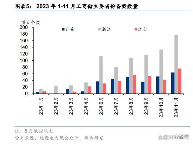 多因素推动,23 年高增趋势初现。根据能源电力说公众号的不完全统计,仅 2023 年 7-11 月,国内工商业储能备案项目个数达 1305 个。从工商业分布较为集中的广东、浙江、江苏 三个省份来看,月度备案项目数量均呈现大幅上升趋势。据不完全统计,2023 年以来我国 工商业储能备案规模已经达到 3.46GW/9.26GWh。工商业储能高速增长的势头已经初步显 现,2023 年成为国内工商储的放量元年。