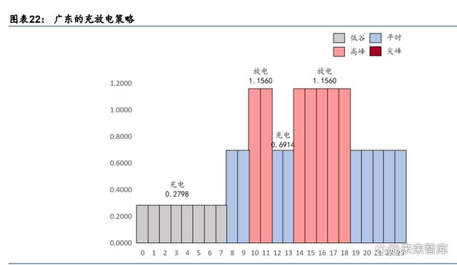 5)广东:我们统计了广东(东西两翼地区)、广东(惠州市)、广东(江门市)、广东(粤 北山区)、广东(珠三角五市)在单一制、两部制和各种电压等级下的 2023 年 12 月尖峰、 高峰、平时、低谷电价,通过算数平均的尖峰、高峰、平时、低谷电价分别为 1.4383 元/kWh、 1.1560 元/kWh、0.6914 元/kWh、0.2798 元/kWh。广东 7-9 月可采用“谷充峰放+谷充尖 放+平充尖放+平充尖放”的 2 次充放模式,其他月份可采用“谷充峰放+平充峰放”的 2 次充放模式,全年加权平均放电电价为(1.4383*3/4+1.1560*1/4)*3/12+1.1560*9/12≈ 1.2090 元/kWh,全年加权平均充电电价为(0.6914+0.2798)/2≈0.4856 元/kWh,全年加 权平均电价差为 1.2090-0.4856≈0.7234 元/kWh。无杠杆、仅考虑峰谷套利的情况下,项 目 IRR 为 8.05%。